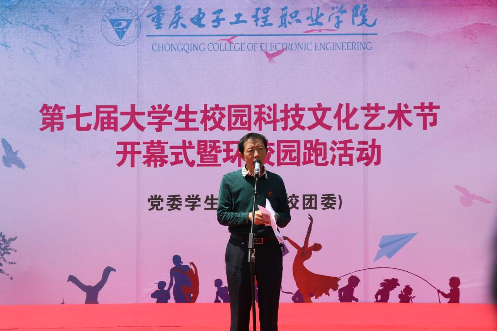 最后,由校党委唐玉林副书记讲话并宣布重庆电子工程职业学院第七届大学生校园科技文化艺术节开幕,他希望广大青年学生要坚定文化自信、坚守文化立场、坚持立德树人、坚持文化兴校、坚持创新驱动、坚持成长成才,弘扬社会主义核心价值观,弘扬以爱国主义为核心的民族精神和以改革创新为核心的时代精神,努力成为一个能够担当复兴大任的时代新人。