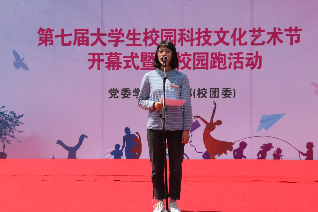 开幕式在一段热情澎湃的街舞中拉开帷幕,何光明宣读了本次科技文化艺术节活动项目,在为期两个月的时间内将陆续开展环校园跑、戏曲进校园、“律动青春”校园十佳歌手大赛、“韵动青春”大学生“五人制”足球赛等十六项比赛和活动。随后,学生代表田朴岑发言,她说道,科技文化艺术节就是我们学习的第二课堂,我们需要丰富多彩的课外活动来提高我们的综合素质,我们始终要高扬理想信念旗帜,在校园中大力弘扬主旋律、传播正能量,牢固树立“四个意识”,承担历史责任,争做时代的弄潮儿。
