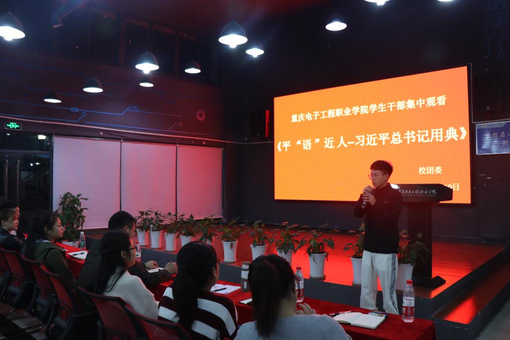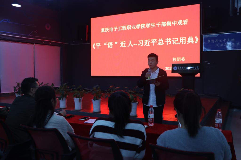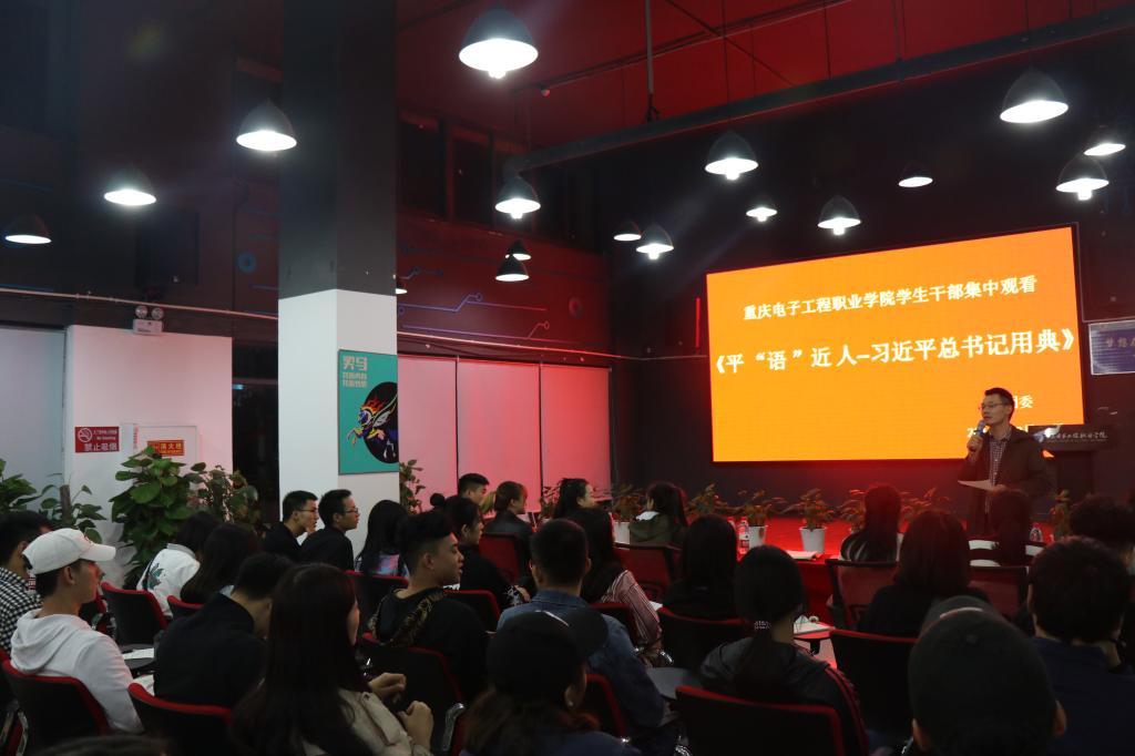 为了深入学习贯彻习近平总书记系列重要讲话精神,引导广大青年学生在思想与行动上向习近平总书记学习,2018年10月10日晚八点,重庆电子工程职业学院校团委组织学生干部在众创空间路演大厅集中观看了由中央电视台综合频道推出的《百家讲坛》特别栏目《平“语”近人——习近平总书记用典》。校团委老师及校学生干部共80余人一同观看了专题片。
