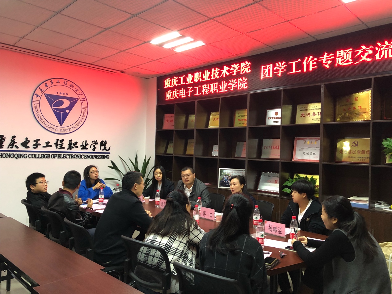 2018年10月19日上午10:00,重庆工业职业技术学院、重庆电子工程职业学院团学工作专题交流会在重庆电子工程职业学院7201会议室顺利召开。参与此次交流会的领导和老师有重庆工业职业技术学院团委书记傅田、团委副书记汤程桑、团委干事杨璐溢、团委干事颜梦晴、重庆电子工程职业学院团委书记袁玉刚、建筑与材料学院学生管理科科长兼团委副书记凌绪、财经管理学院团学工作负责人苏逸、团委干事张妙龄、团委干事佘妮娟、团委干事丁文雅、团委干事彭婧。会议由袁玉刚书记主持。