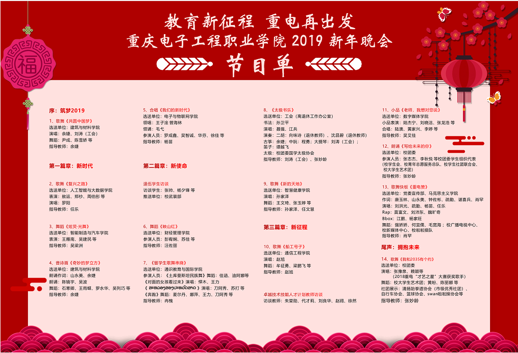 晚会围绕“新时代”“新使命”“新征程”三个篇章展开,有《太极书乐》、歌舞《船工号子》、小品《老师,我想对您说》等14个节目,有孙卫平书记的挥毫泼墨,有聂强校长的一展歌喉,有教师代表的风采展示,让观众感受到学校党政领导对学校校园文化发展的高度重视;有学生代表的精彩演绎,有边境争端中立功受奖的退伍学生和卓越技术技能人才计划教师的交流访谈,让观众感受到学校全员参与的积极性;还有机器人“重电小团团”的晚会助阵,让观众切实感受到智能制造时代的到来。其中歌舞《复兴之路》,回首了民族振兴的艰辛,回首了改革开放40年的不易;《炫荧光舞》凭借绚丽创意的装扮和动感的旋律引爆全场;《太极书乐》展现了中华优秀传统文化的博大精深,鸿雁传情致意,太极阴阳之道;《留学生歌舞串烧》更是为晚会增添了一丝异域风情,充分说明开放办学与教育国际化进程不可逆转;《写给未来的你》让大家相信未来的你一定会感激现在努力的自己;《重电赞》以歌舞、快板、rap等多种形式展示了重电丰厚的历史沉淀、不息的龙马精神和今日的风光灿烂。