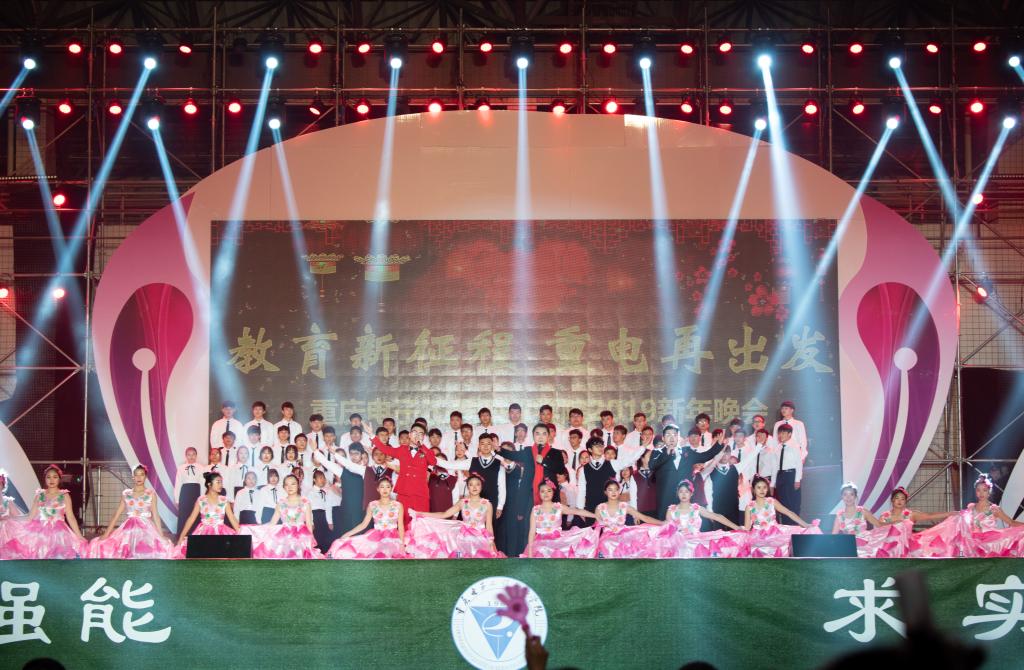 12月26日19时,我校2019年“教育新征程 重电再出发”新年晚会在奕晖运动中心隆重举行。出席晚会的领导有学校党委书记孙卫平,学校聂强校长,校党委唐玉林副书记,学校王平副校长,校纪委陈丽书记,学校谢义华副校长,学校冉学农副校长,校党委委员、党委组织统战部刘洪光部长,校党委委员、党委宣传部疏勤部长,原重庆职业学院党委书记陈东林,学校原副校长苏小柱教授。参加本次晚会的还有学校各职能部门、各二级学院的领导和师生共计五千余人。