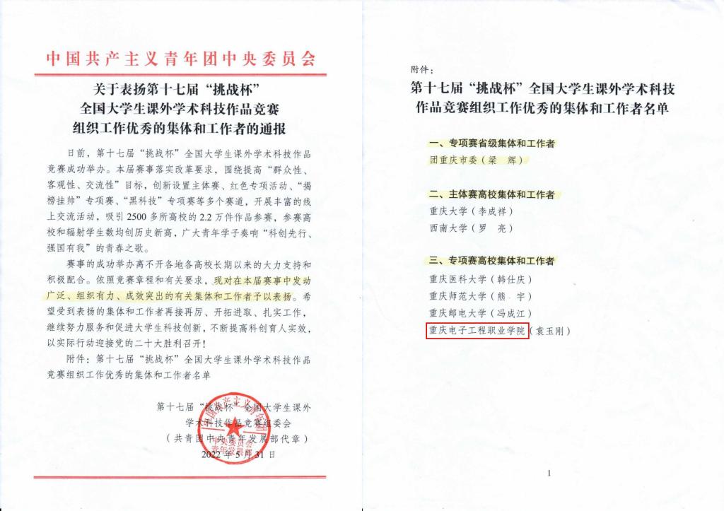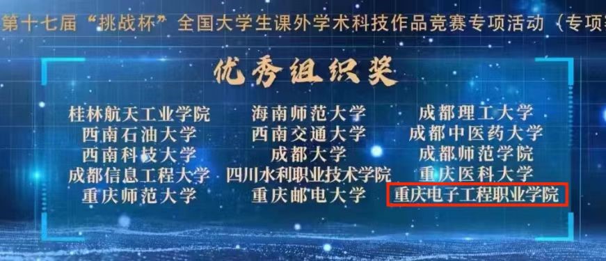 第十七届“挑战杯”全国大学生课外学术作品竞赛在四川大学落下帷幕,重庆电子工程职业学院荣获“挑战杯”竞赛专项赛优秀组织奖,全国共15所本专科院校获此殊荣。习近平总书记强调:“科技创新是人类社会发展的重要引擎,是应对许多全球性挑战的有力武器,也是中国构建新发展格局、实现高质量发展的必由之路。”加大技术技能英才教育,提高学校创新创业水平,是我校在推进高等教育综合改革、提高人才培养质量方面的重要举措之一。