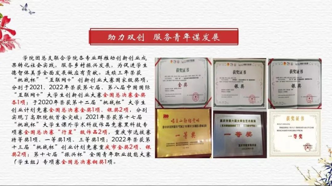 助力双创,服务青年谋发展。财经管理学院团总支加强创新创业社会实践教育,引领青年学生在实践中受教育、长才干、做贡献,培育高职院校卓越工匠和时代精英。进行创新创业人才培养和项目孵化,建立“学生实践——教师科研——科技创新”师生循环互动模式,开展2022年大学生创新创业培训和创业计划竞赛培训,2022年组织双创培训共计528人次,共计培养36名国家级双创冠亚军和一批重电“创客”榜样人物,孵化三家大学生创业企业;双创教育与实践成果推广取得了显著成效,得到了学校、重庆市的认可,多次承办组织重庆市“双城青才讲堂”“重庆青年创业导师高校行”等专题培训。