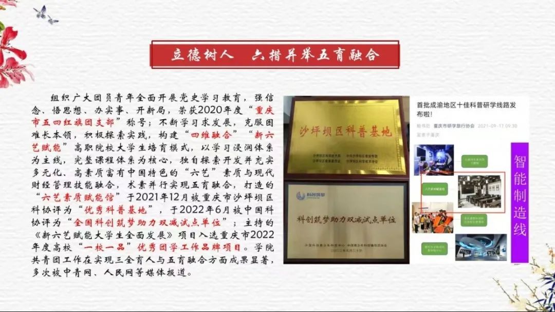 锐意进取,展现共青团良好风貌。财经管理学院团总支不断深化改革、锐意进取、六措并举五育融合,展现共青团良好风貌。夯实根基深化组织建设,全面组织二十大精神专题学习教育64场。文化传承厚植家国情怀,2022年开展文化传承实践教育活动100余场,参训学生共计13020人次。活动蕰育塑造精神品格,2022年开展线上线下科技文化体艺活动200余场,学生参与率100%。实践承载培育工匠精英,创新创业成果突出,多次荣获国家级金奖。精准帮扶关爱学生成长,毕业生就业培训全覆盖,团干部结队帮扶家庭困难学生解决实际问题。探索实践构建育人模式,三全育人、五育融合教育体系完善,多次被中青网、人民网等媒体报道。