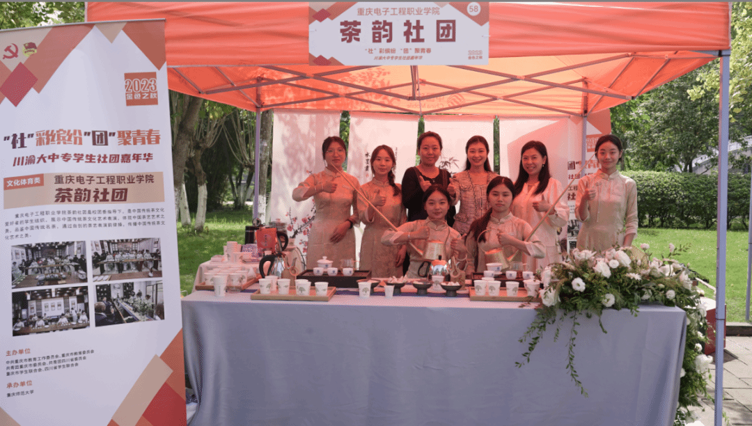 10月15日,由重庆市委教育工委、重庆市教委、共青团重庆市委、共青团四川省委、重庆市学联、四川省学联主办的2023年“金色之秋”川渝大中专学生社团文化节开幕式暨“‘社’彩缤纷‘团’聚青春”社团嘉年华顺利举行。本次活动围绕“学习二十大、永远跟党走、奋进新征程”主题主线,聚焦习近平总书记关于高校思想政治工作和青年工作的重要论述,通过集中展示和主题分享相结合的形式,搭建社团学习交流平台、激发社团创新创造活力、展示学生昂扬向上的精神面貌和社团风采,进一步丰富学生课余生活,繁荣校园文化,加快形成一批有重庆辨识度、有影响力的社团标志性成果。重庆电子工程职业学院茶韵社团入选参加本次社团嘉年华展示交流活动。