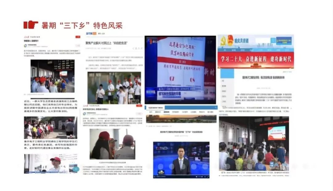 通信工程学院在学校党委的指导下,紧紧围绕习近平总书记在全国思想政治教育大会上指出的“把立德树人作为中心环节, 把思想政治工作贯穿教育教学全过程,实现全程育人、全方位、全过程育人”,推动“党建带团建,团建促党建”深度融合,打造学院特色品牌。一、实施三全育人工程,培育时代新人“生力军”,获得重庆市优秀三好生15人、优秀干部7人、优秀毕业生31人;在2022年共青团“五四”评优中,获校级2021-2022 学年度“优秀学生会”, “最美团支部书记”1名,“青年志愿者先进个人”17名,有17名团干部荣获“优秀共青团干部”表彰等。二、以特色党建团建活动为抓手,增强育人品牌影响力。荣获“喜迎二十大、永远跟党走、奋进新征程”第 41届川渝“校园之春”文化艺术体育活动 “‘职’在必得”川渝大学生“职场8小时”挑战赛市级三等奖一项;通信工程学院党史学习教育团被评为2022年重庆电子工程职业学院暑期文化科技卫生“三下乡”社会实践活动先进集体优秀团队,志愿服务被重庆网络广播电视台、视界网、重庆广电第1眼新闻报道4次,师生党建团建活动、社会实践被学习强国、新华网、人民日报、重庆共青团、重庆卫视新闻联播等10余家媒体报道109次。