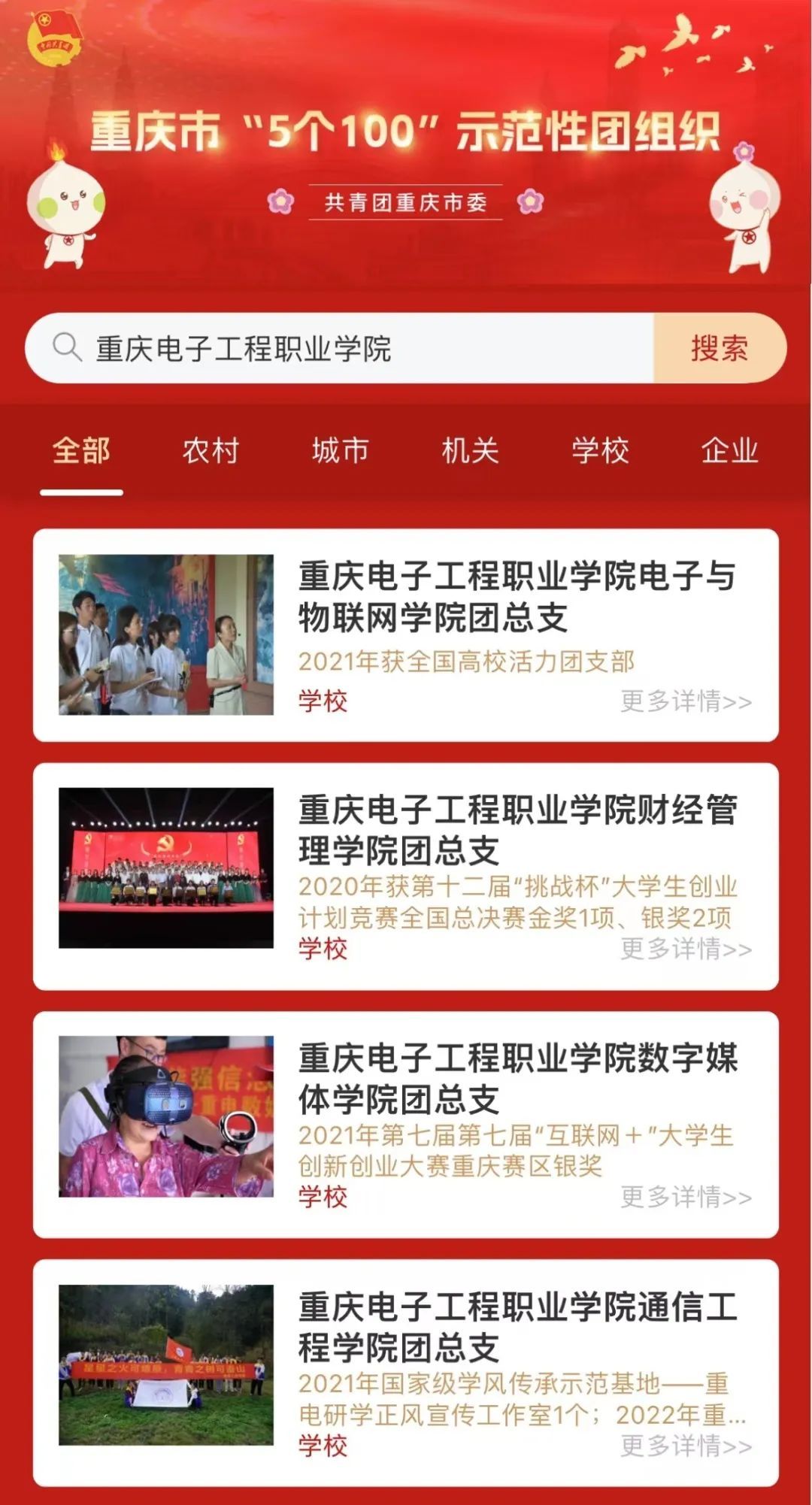 近日,共青团重庆市委员会公布了第二批重庆市“5个100”示范性团组织培育选树名单,我校数字媒体学院团总支和通信工程学院团总支被选树为重庆市“5个100”示范性团组织。此次培育选树行动面向农村、城市、机关、学校、企业5个领域各培育选树100个具有代表性的示范性团组织,以培育选树先进典型促进基层团组织规范化建设,以点上示范带动面上整体活力提升。此前,我校电子与物联网学院团总支和财经管理学院团总支被选树为重庆市首批“5个100”示范性团组织。
