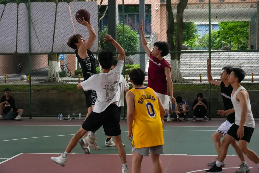 学生代表组成10支篮球队伍,走出教室,走进赛场,以拼搏之姿,展青春风采。球场上运动员们斗志昂扬,你争我抢,配合精妙,充分发扬顽强拼搏、勇于争先的团队精神。投篮、盖帽、抢断,攻防有序,使整个比赛高潮迭起,全员沉浸在紧张而又欢乐的氛围中,场下的加油助威此起彼伏,比赛氛围热情高涨。