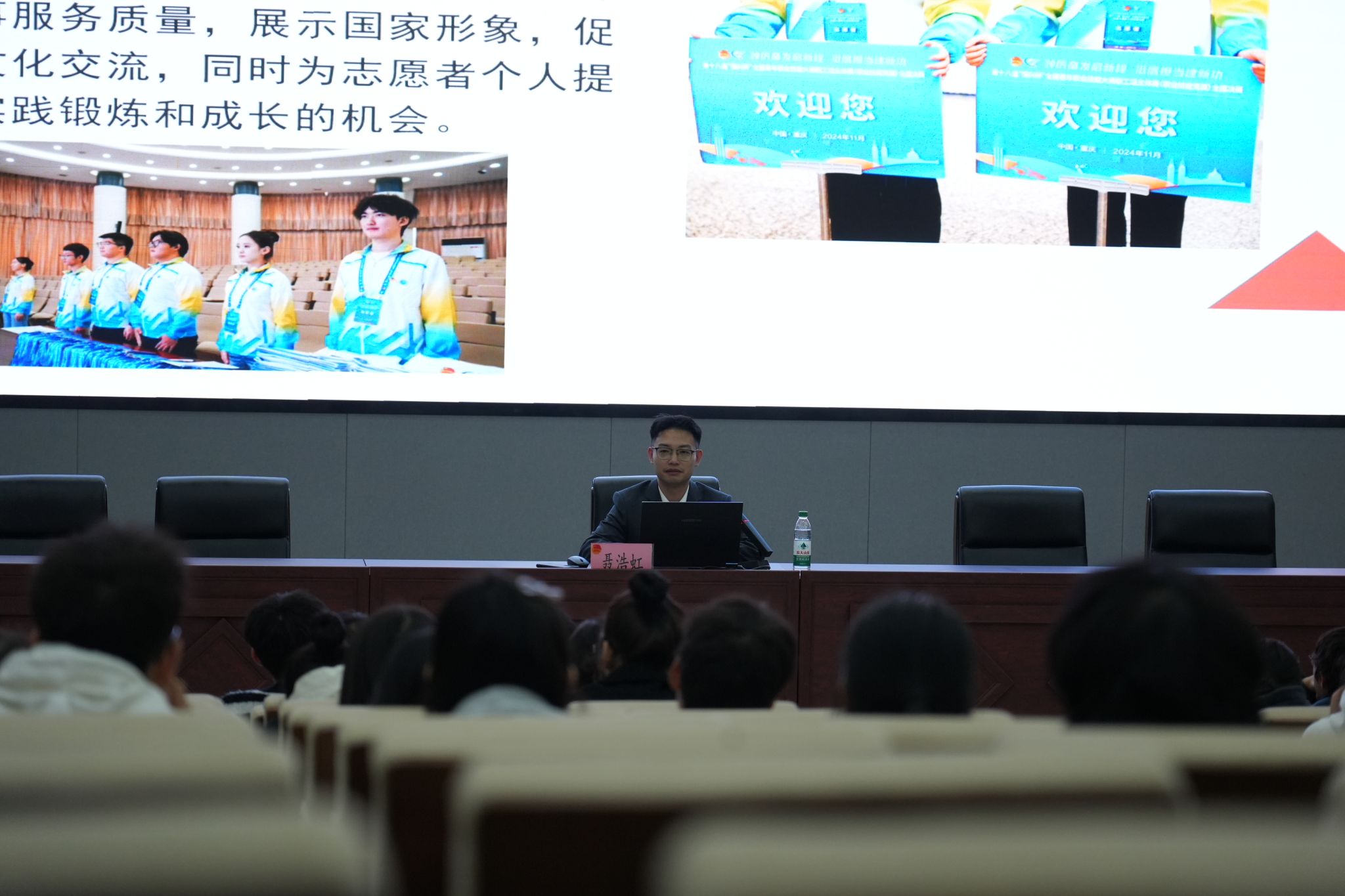 校团委兼职副书记、电子与物联网学院团总支书记聂浩虹老师以《献血与赛会志愿服务工作展示》为题,通过具体实例介绍了我校主要开展的志愿服务活动以及在志愿活动中具体该怎么做。聂老师谈到,我们广大青年要积极参与到志愿活动中来,充分认识到志愿活动的意义,用自己的实际行动为社会贡献力量。