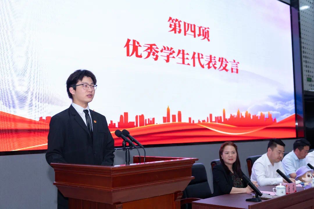 财经管理学院团总支书记汪佐丽老师和校学生会功能型团支部书记、智能制造与汽车学院机电2302班的卞一鸣分别发言。汪佐丽老师表示要坚持以“党建带团建”为抓手,牢记为党育人、为国育才的根本使命,贯彻“三全育人、五育融合”教育发展理念。卞一鸣同学表示重电青年要始终与学校同频共振,与时代同向而行,把“个人梦”融入“中国梦”,在技能报国的赛道上跑出青春的最好成绩。