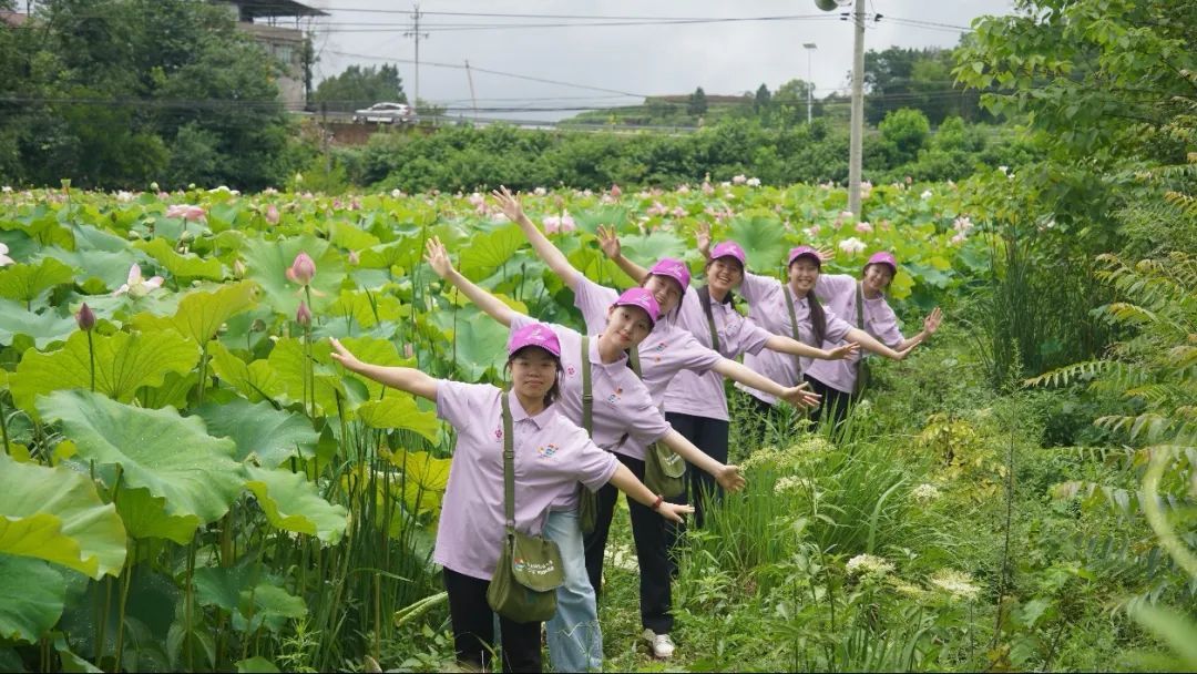 脚步未停,团队又转场荷花基地。碧叶连波,花影摇曳,同学们俯身测水深、观藕节、认共生生物,在一朵荷的生态链里看见乡村的勃勃生机。