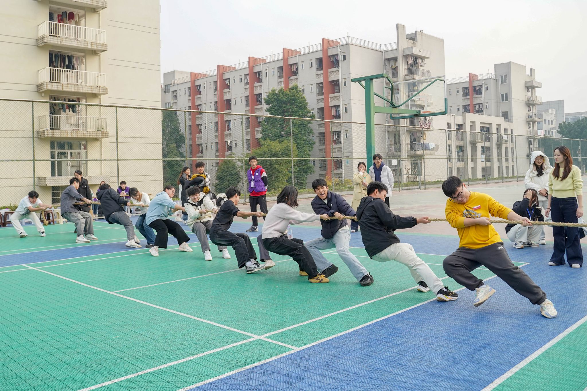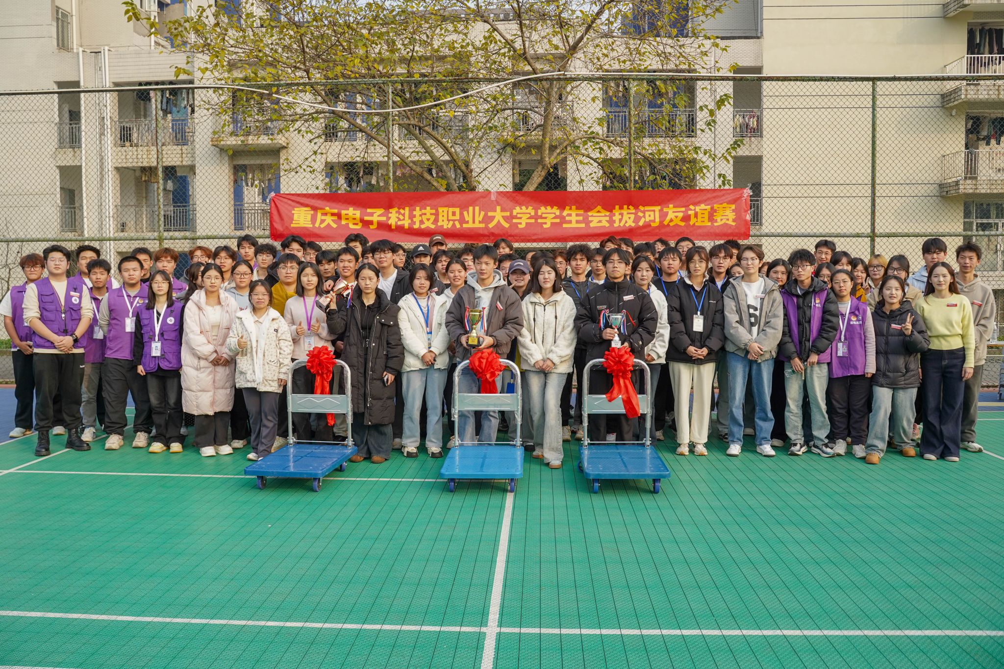 为丰富校园文化生活,培育学生会组织集体荣誉感与团队协作精神,2025年12月18日,校学生会在北区篮球场举行重庆电子科技职业大学学生会组织拔河友谊赛。本次比赛共有8支学生会队伍参赛,共计100余人参与。