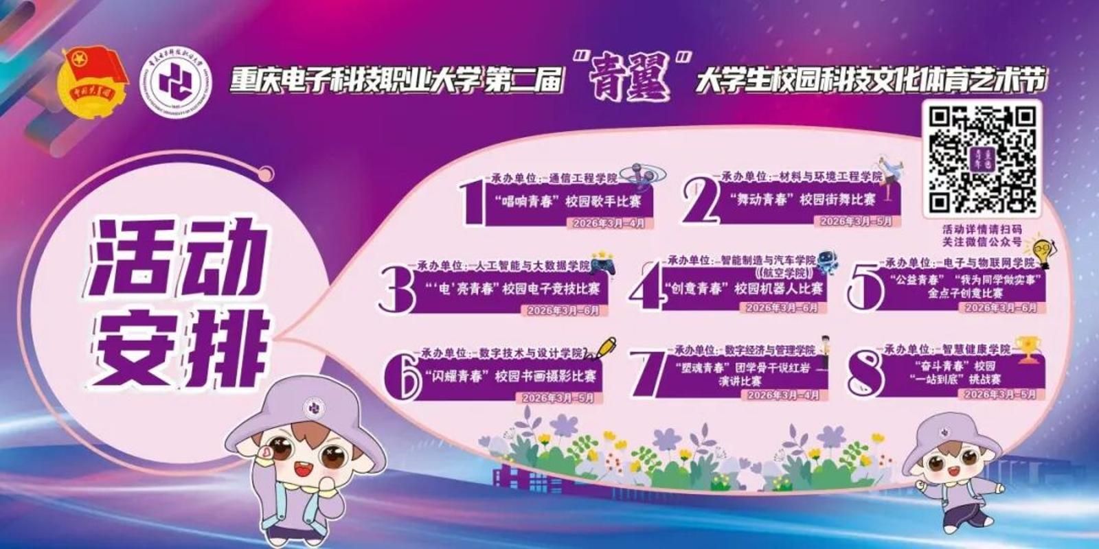 为深学笃行习近平新时代中国特色社会主义思想,全面贯彻习近平总书记关于青年工作的重要思想和关于教育的重要论述,认真落实团市委、学校相关工作要求,充分发挥共青团在高校思想政治工作中的主力军作用,围绕立德树人根本任务,推动共青团“红岩新青年”高校大思政育人体系建设,引导广大青年师生做有理想、敢担当、能吃苦、肯奋斗的新时代好青年。2026年3月26日,重庆电子科技职业大学第二届“青翼”大学生校园科技文化体育艺术节启动仪式在博远厅举行。