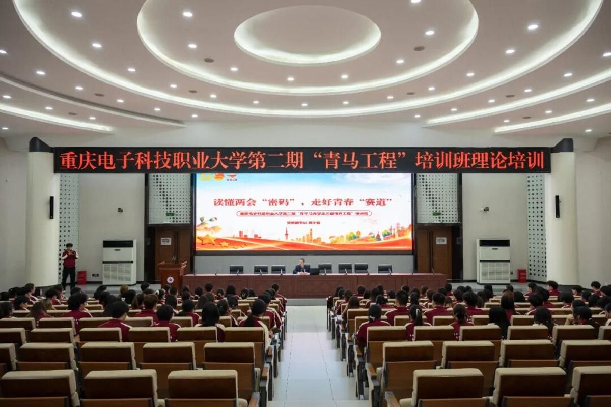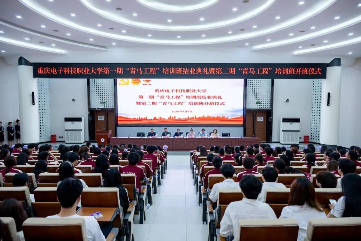 2026年4月8日下午,重庆电子科技职业大学第一期“青马工程”培训班结业典礼暨第二期“青马工程”培训班开班仪式在博远厅顺利举行。党委副书记龚小勇,党委常委、党委组织部部长、党委统战部部长疏勤,党委学生工作部部长江兵,工会常务副主席王永中,党委宣传部副部长肖罕,二级学院党总支书记(副书记),各二级学院团总支书记,“青马工程”导师代表,第一期“青马工程”优秀学员代表及第二期“青马工程”全体学员共计200余人参加此次会议。校团委书记钟佐彬主持会议。