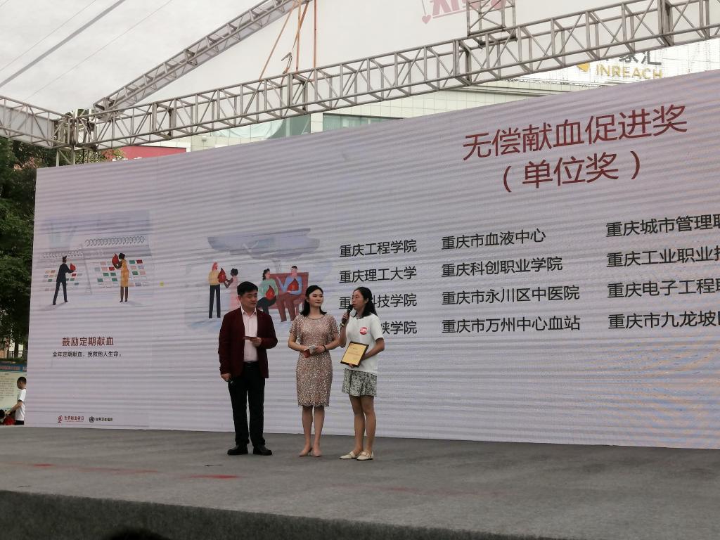 2019年6月14日是第十六个世界献血者日,“重庆市无偿献血表彰大会”在九龙坡区九龙广场隆重举行。长期以来,学校在无偿献血事业中作出了积极贡献,学校被授予2016-2017年度“全国无偿献血促进奖单位奖”荣誉称号,全市仅有12个单位获此殊荣。