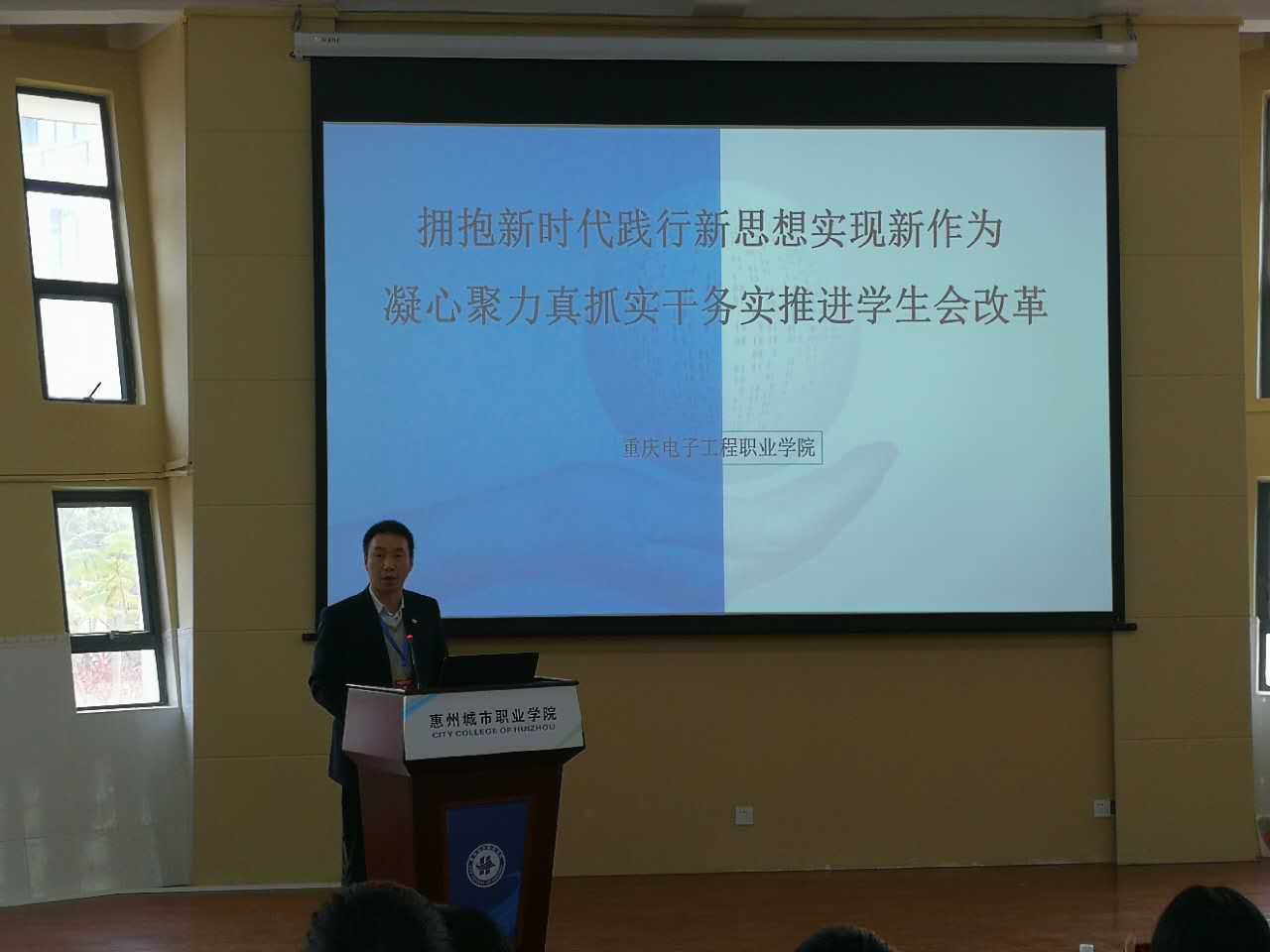 重庆电子工程职业学院团委书记钟佐彬、武汉职业技术学院团委书记杨爱霞、深圳职业技术学院团委书记张锋兴、常州工程职业技术学院团委书记蒋文嵘就高职院校共青团改革作典型经验交流。我校钟佐彬书记在本次年会上以“拥抱新时代,践行新思想,实现新作为,凝心聚力真抓实干务实推进学生会改革”为主题作典型经验交流。