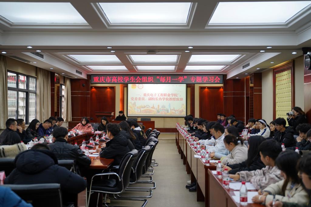 2019年12月27日,由市学联主办的高校学生会组织的“每月一学”12月专题学习会在我校顺利举行。学校党委委员、副校长冉学农教授,团委书记袁玉刚、学工部副部长蒋斌、市学联秘书处相关负责人、市学联驻会执行主席、第二片区33所高校学生会负责人、我校团学干部共计80余人参加会议。