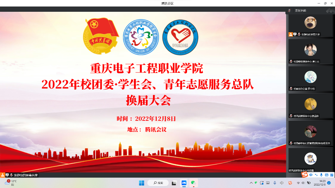 2022年12月8日下午,重庆电子工程职业学院2022年第十六届校团委·学生会、第十三届青年志愿服务总队换届大会于线上腾讯会议顺利举行。校团委副书记、学生会秘书长范可佳,团委老师张颖、唐吕俊驰,各二级学院团总支学生会主席团代表、校团委·学生会、青年志愿服务总队负责人、各部门工作人员及学生代表共170余人参加此次会议。本次大会由重庆电子工程职业学院第十六届校团委·学生会执行主席张静怡主持。