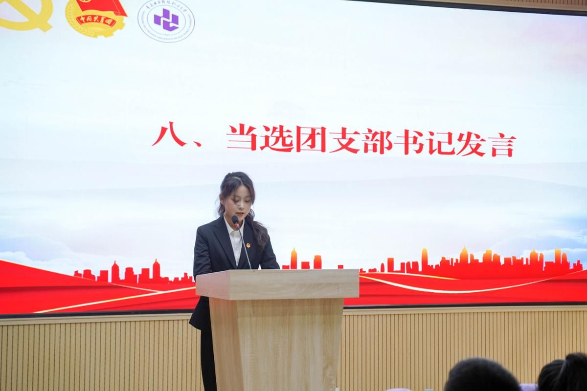 新当选的团支部书记付诗瑶同学代表新一届支委发言,表示将始终以习近平新时代中国特色社会主义思想为根本遵循,恪尽职守,勇于担当,积极推动团支部建设与学生会工作深度融合,坚持理论联系实际,努力做到学思用贯通、知信行统一,切实发挥功能型团支部的战斗堡垒作用。