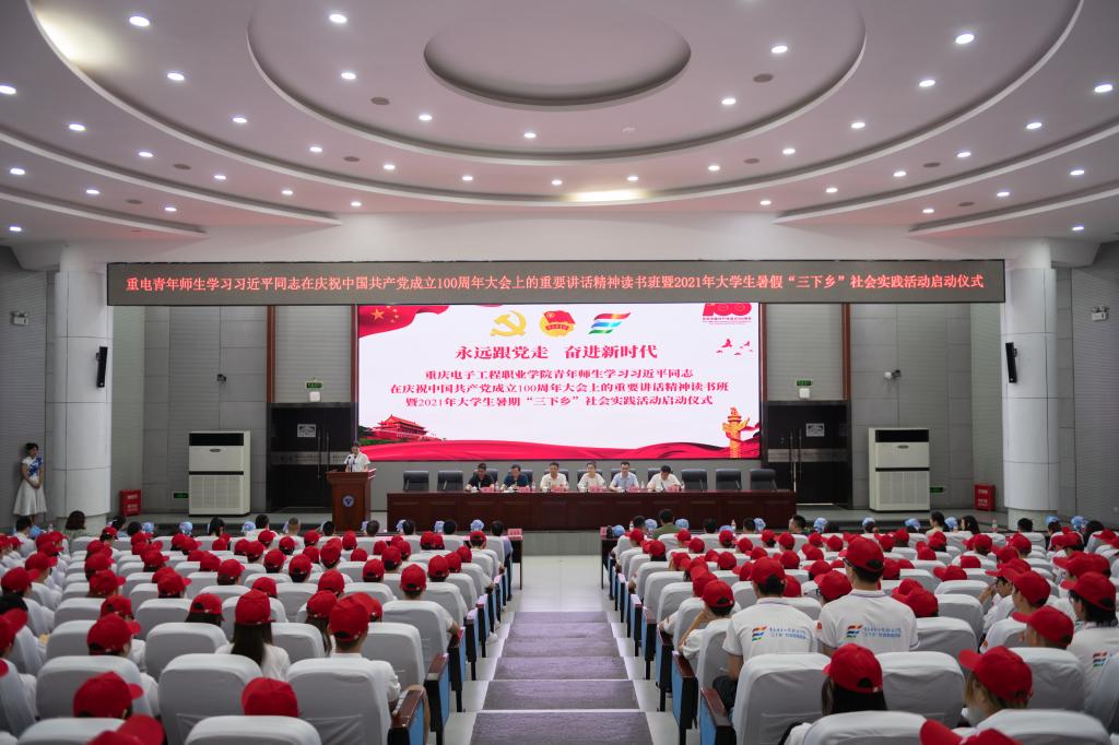 7月2日下午,重庆电子工程职业学院各级团学工作骨干、青年教师共300余人在学校博远厅举行了以“永远跟党走 奋进新时代”为主题的学习习近平同志在庆祝中国共产党成立100周年大会上的重要讲话精神读书班暨2021年暑期“三下乡”社会实践活动启动仪式。校党委委员、副校长冉学农,党委委员、宣传部部长、马克思主义学院院长疏勤,党委学工部部长何光明、副部长江兵,马克思主义学院党总支副书记、副院长冉鑫,各二级学院党总支书记、副书记、团总支书记、学管科科长出席会议,会议由校团委书记袁玉刚主持。
