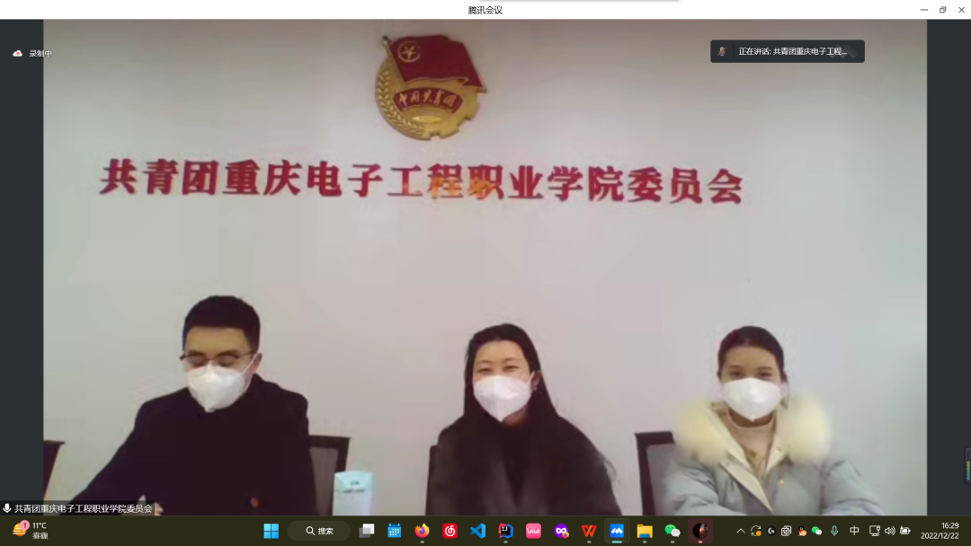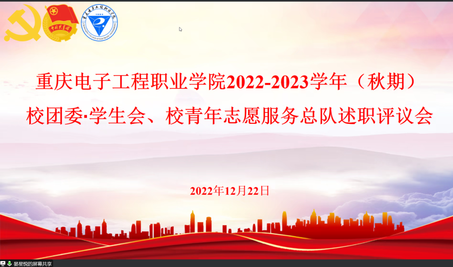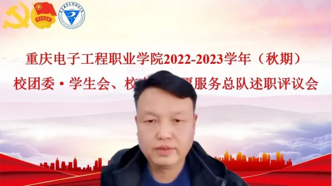 为深学笃用习近平新时代中国特色社会主义思想,深入贯彻落实党的二十大精神,全面落实团学改革相关工作要求,加强学生组织内部建设,推动学生组织持续发展。12月22日下午,重庆电子工程职业学院2022—2023学年(秋期)校团委·学生会、校青年志愿服务总队述职评议会于线上顺利举行。党委学生工作部副部长蒋斌,校团委副书记、学生会秘书长范可佳,校团委专职干部张颖、唐吕骏驰,二级学院团总支书记出席会议,重庆科技学院学生代表李月琪、述职学生骨干、各学生工作部门工作人员代表和二级学院普通学生代表参加会议。本次述职评议会由晏星悦同学主持。
