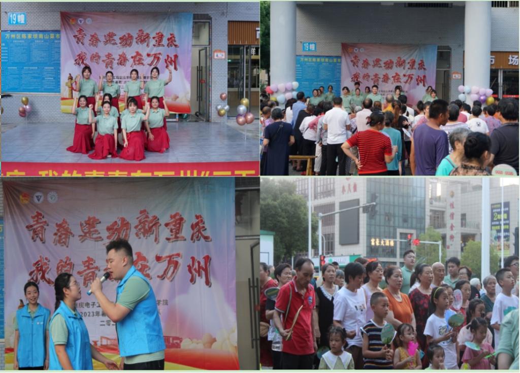 为持续丰富人民群众精神文化生活,促进和美宜居社区建设,不断提升人民群众的文化获得感和幸福感。近日,重庆电子工程职业学院智慧健康学院“萤火虫”三下乡社会实践团为万州区陈家坝街道南山社区居民带来了一场以“青春建功新重庆,我的青春在万州”为主题的文化惠民演出,真正将文化惠民、服务社区百姓落到实处。