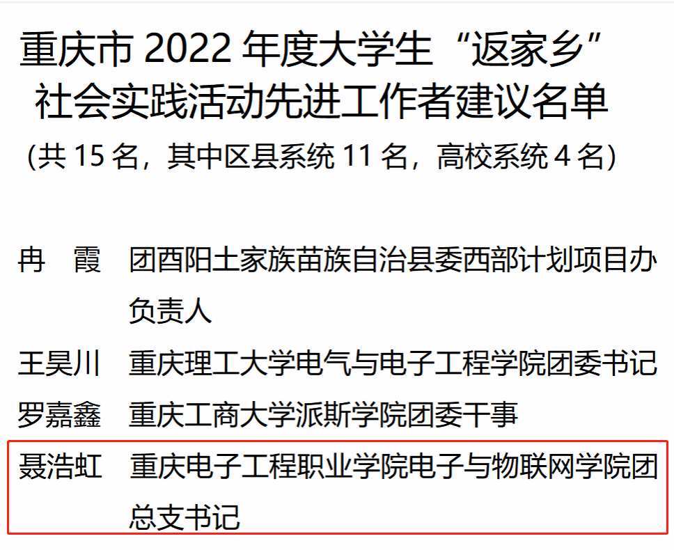 按照团中央统一部署,团市委组织开展了重庆市2022年度大学生“返家乡社会实践活动,经个人申报、单位推荐、材料审核,拟确定团重庆市涪陵区委等20个基层团组织2022年度大学生“返家乡”社会实践活动优秀单位,团重庆市渝中区委西部计划志愿者王俐园、重庆电子工程职业学院电子与物联网学院团总书记聂浩虹等15名同志为2022年度大学生“返家乡”社会实践活动2022年度大学生“返家乡”社会实践活动先进工作者,北京大学2021级本科生陈雅楠、重庆电子工程职业学院电子与物联网学院应用电子技术2101班学生唐秋吉等37名大学生为2022年度大学生“返家乡”社会实践活动优秀个人,“百名学子看渝中”等6个项目为2022年度大学生“返家乡”社会实践活动优秀品牌项目。