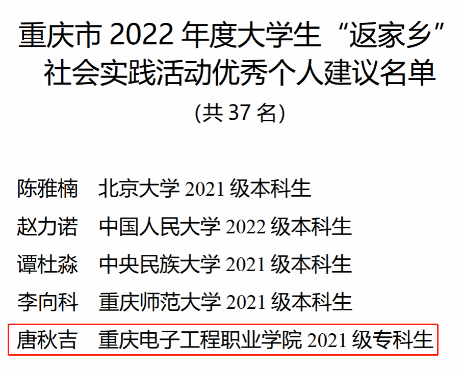 重庆市2022年度大学生“返家乡”社会实践活动优秀个人名单