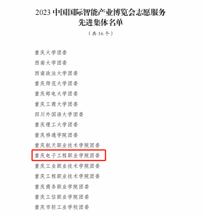 由工业和信息化部、国家发展改革委、科技部、国家网信办、 中国科学院、中国工程院、中国科协、新加坡贸工部和重庆市人民政府主办的 2023 中国国际智能产业博览会于 2023 年 9 月 4 日至 6 日在渝举办。学校团委荣获2023 中国国际智能产业博览会志愿服务先进集体,我校6名学生荣获2023中国国际智能产业博览会志愿服务先进个人(张馨悦(女):重庆电子工程职业学院数字媒体学院2021级广播影视节目制作专业学生;付世龙:重庆电子工程职业学院电子与物联网学院2021级智能互联网络技术专业学生;蒙静(女):重庆电子工程职业学院数字媒体学院2022级广播影视节目制作专业学生;刘蕊函:重庆电子工程职业学院电子与物联网学院2021级微电子技术专业学生;李永益:重庆电子工程职业学院建筑与材料学院2021级工程造价专业学生;王小满(女,土家族):重庆电子工程职业学院通信工程学院2022级城市轨道交通通信信号技术专业学生)。