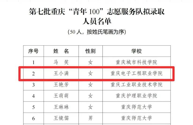 2023年11月7日,重庆共青团-青年志愿者微信公众号公布了第七批重庆“青年100”志愿服务队拟录取人员名单,我校通信工程学院“星火”志愿服务支队的王小满同学被成功录取。