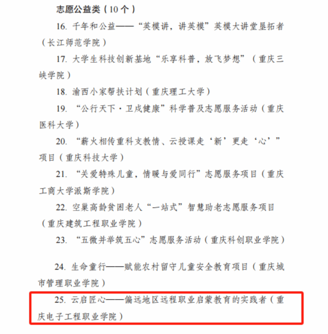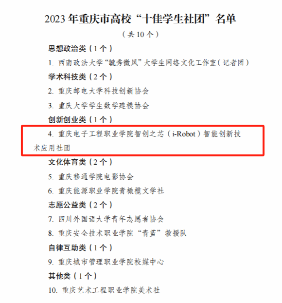 2023年3月,团市委、市委教育工委、市教委、市学联联合开展 2023年重庆市高校“一校一社一品”优秀学生社团及项目品牌培育建设工作,吸引市内64所高校300余个社团及项目参与,涵括思想政治、学术科技、创新创业、文化体育、志愿公益、自律互助等7个类别。按照《关于开展2023年重庆市高校“一校一社一品”优秀学生社团及项目品牌培育建设工作的通知》要求,举办交流展示活动,对150个入围社团及项目品牌进行了终审,我校智创之芯(i-Robot)智能创新技术应用社团获“十佳学生社团”,云启匠心——偏远地区远程职业启蒙教育的实践者获“优秀学生社团项目品牌”。