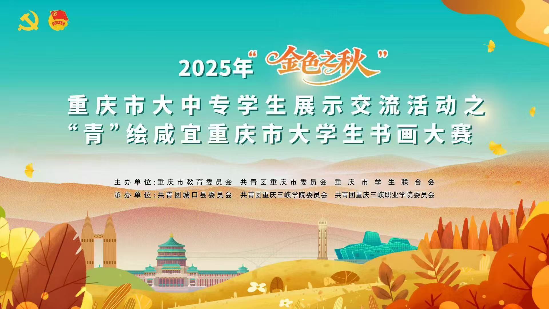 11月8日—9日,由重庆市教育委员会、共青团重庆市委员会、重庆市学生联合会、共青团城口县委员会、共青团重庆三峡学院委员会、共青团重庆三峡职业学院委员会联合主办的2025“金色之秋”重庆市大中专学生展示交流活动之“青”绘咸宜重庆市大学生书画大赛于城口县咸宜镇中国西南国际写生基地顺利举行。