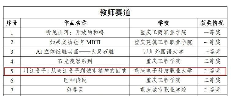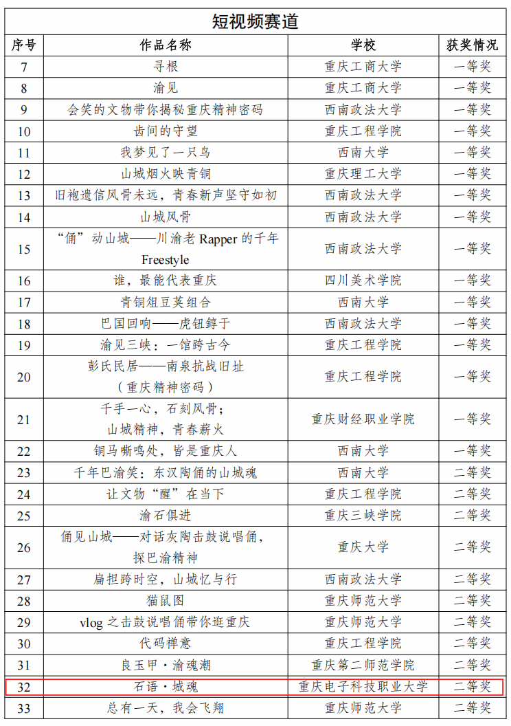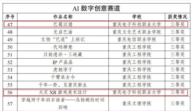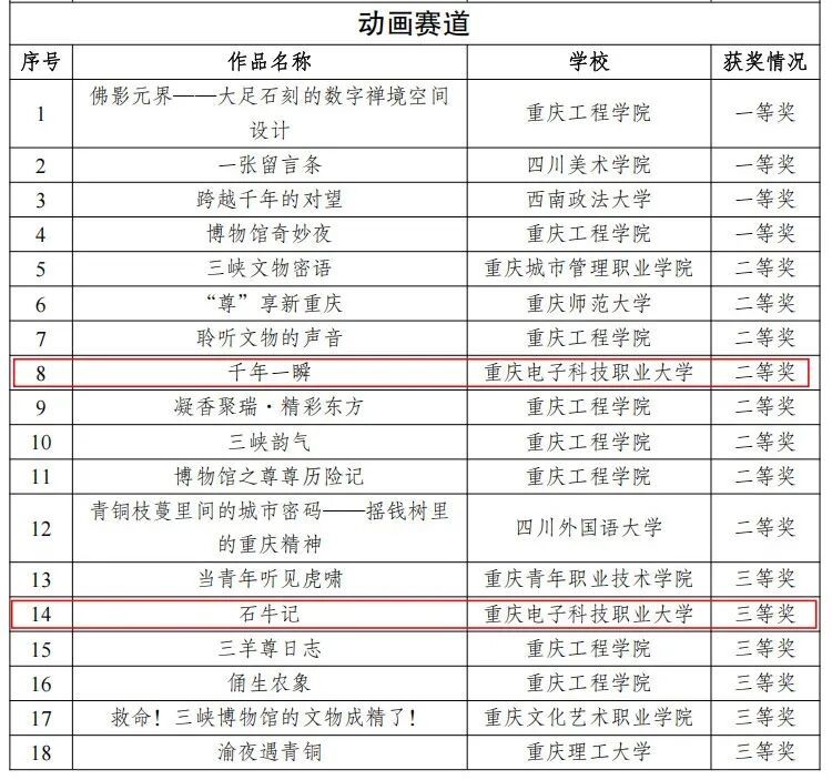 本次大赛设有短视频、动画、AI数字创意三个类别,围绕“青春为中国式现代化挺膺担当”主题,以“坚韧、忠勇、开放、争先”的重庆城市精神为导向,将重庆中国三峡博物馆、大足石刻研究院作为创作切入点,深入挖掘文化艺术根脉,追溯历史渊源。参赛作品通过有机融合重庆城市精神与巴渝文化,通过多元艺术形式创作兼具思想深度、艺术美感与时代气息的优秀作品,展示了师生的创作热情和创新活力,为传承和弘扬重庆城市精神注入青春力量。
